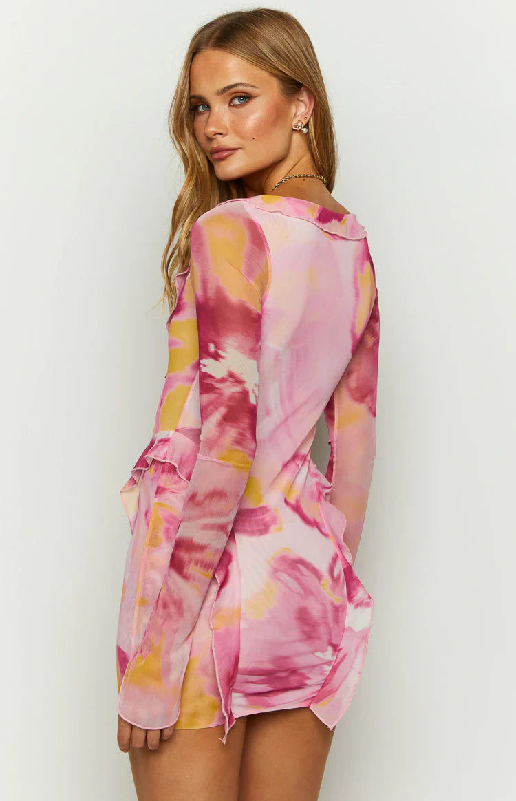 Step into a flirty, feminine moment with our Surround Sound Pink Floral Mesh Long Sleeve , a whimsical piece perfect for a day event or a sunset . This mini features delicate ruffles and a charming front bust tie, all crafted from light weight mesh for an effortlessly playful feel. Pair it with simple sandals or ankle and a cute crossbody bag for a fresh, romantic aesthetic.